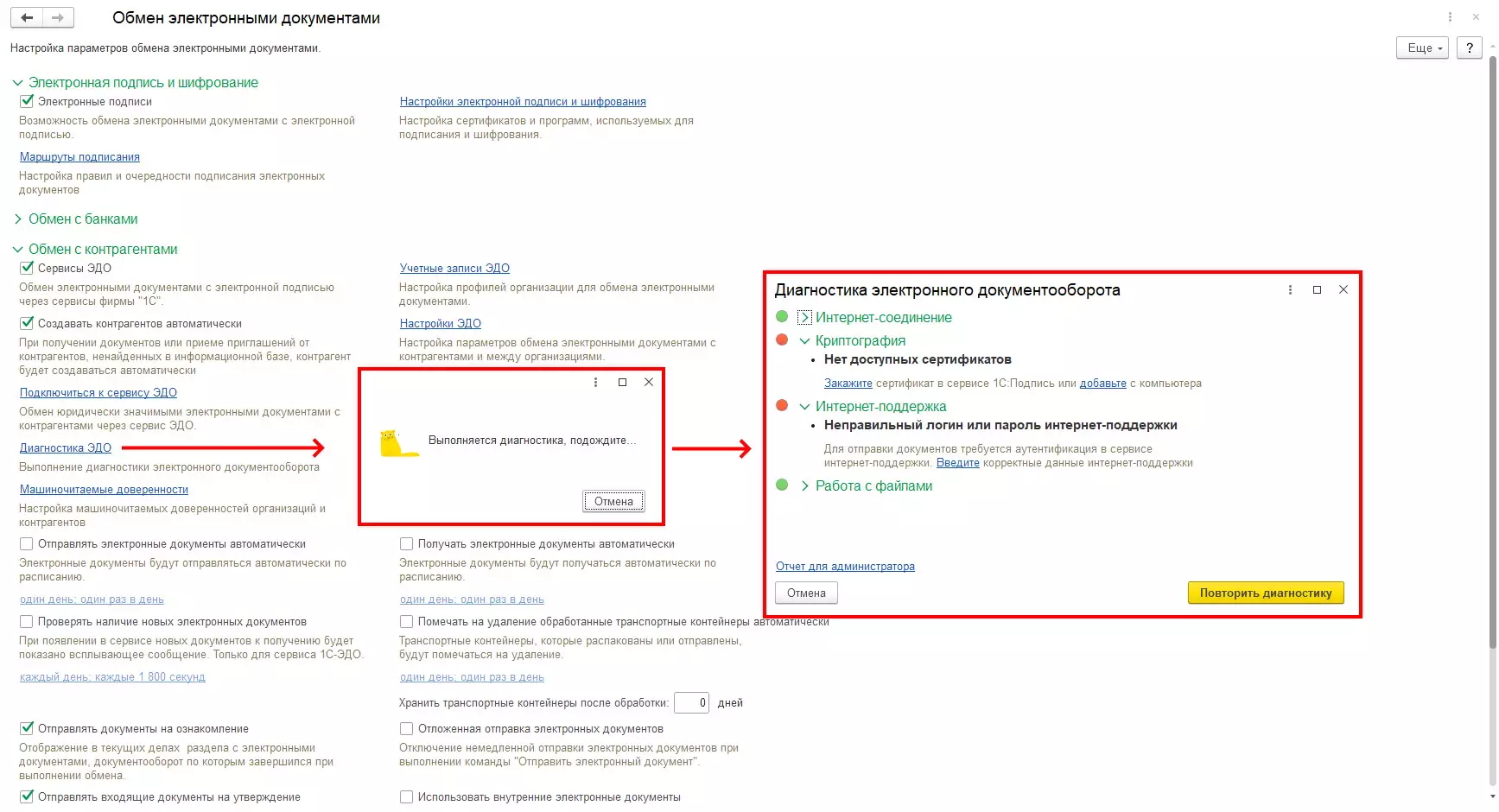 Если ваш документ не отправляется или возникает какая-то ошибка при отправке, то в начале нужно произвести диагностику подключения к системе электронного документооборота.