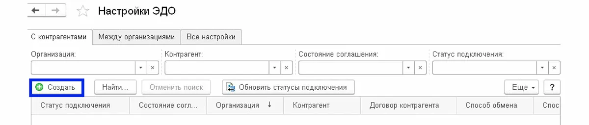 Для передачи контрагентам данных через 1С необходимо не только произвести настройку ЭДО у себя, но и выслать соглашение. Для этого в разделе «Администрирование» откройте «Обмен электронными документами» и нажмите на «Настройка ЭДО». Откроется форма, в который вы сможете ознакомиться с существующими соглашениями и узнать статус каждого из них. Чтобы добавить и осуществить настройку ЭДО для обмена данными из 1С, нажмите кнопку «Создать».