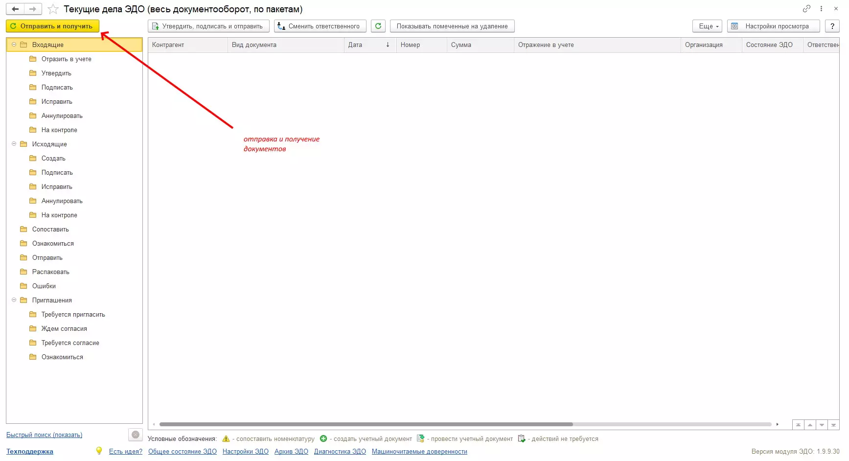 Получить электронные документы можно с помощью обработки «Текущие дела ЭТО», которая позволяет массово отправлять и получать все типы документов.