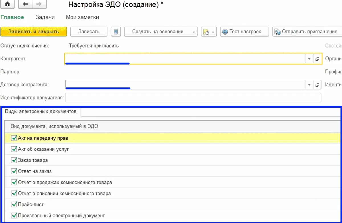 Процесс подключения к сервису 1С-Такском и его настройка ничем не отличаются от вышеописанного. Для организации ЭДО в 1С между компаниями также необходимо выслать приглашения.