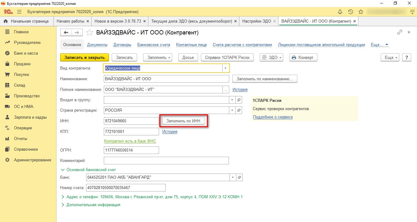 Кроме того, если вы планируете пересылать документы внешним контрагентам, настройка ЭДО требует, чтобы были заполнены следующие поля: