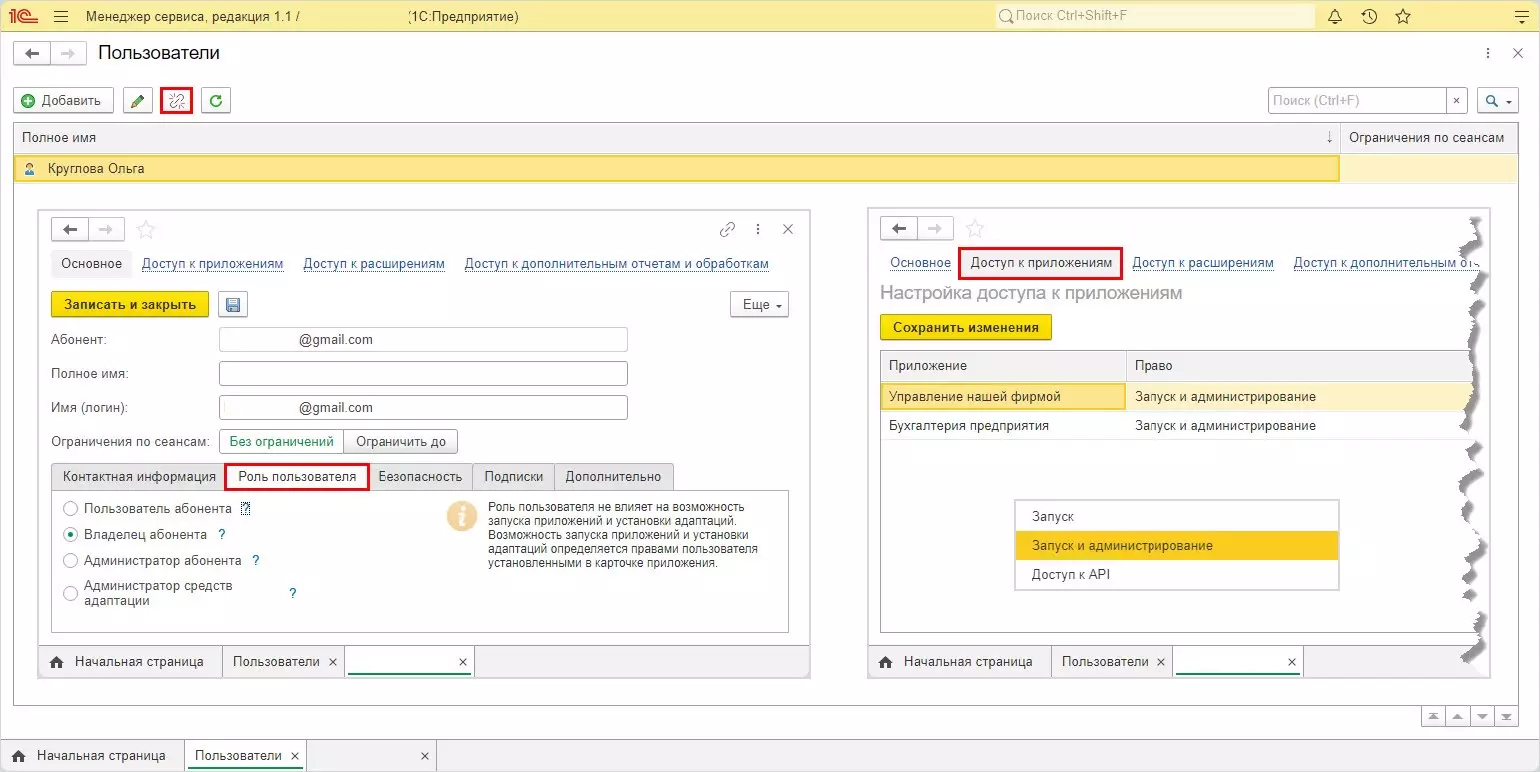 В разделе «Управление пользователями» можно также добавить нового пользователя, отредактировать его, определить доступ к приложениям. Для этого нужно выбрать право только на запуск, или еще администрирование плюс «Доступ к API».