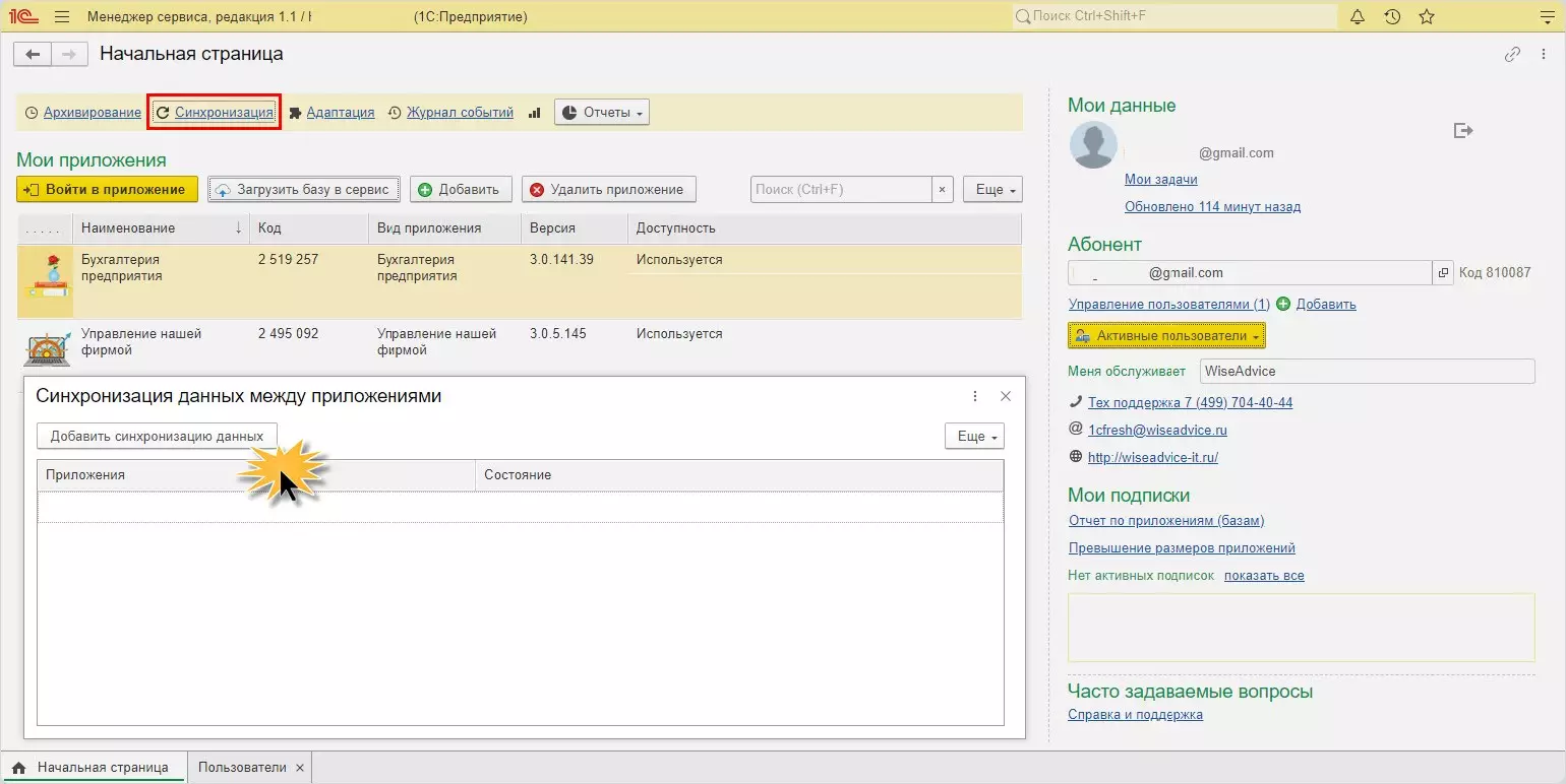 Настройка синхронизации поддерживается в облаке через «Менеджер приложений». В одноименном подразделе по команде «Добавить синхронизацию данных» выполняется ее настройка.
