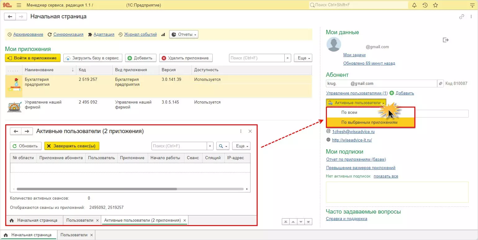 Если пользователь не вышел из приложения, то его можно «выгнать». Для этого в разделе «Активные пользователи» нужно посмотреть, кто находится в системе по конкретному приложению или по всем сразу, и завершить сеанс «зависшему».