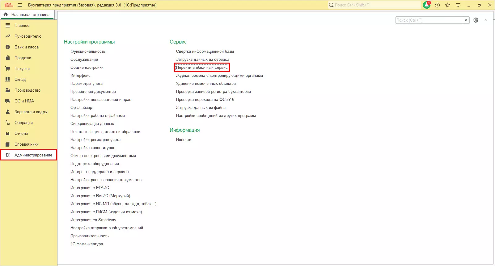 Для перехода в облако достаточно сформировать файл в 1С в разделе Администрирование – Перейти в облачный сервис.