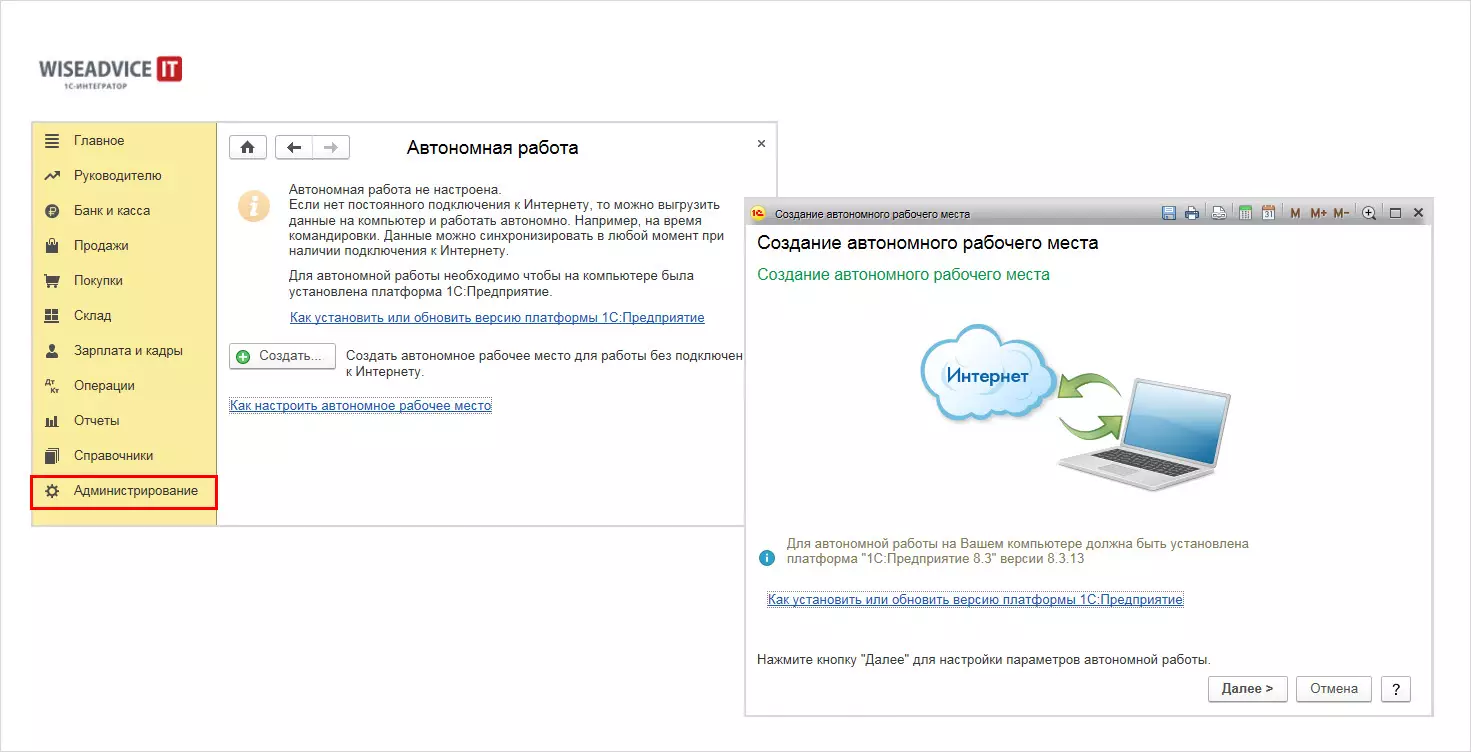АРМ пользователя 1С:Фреш – это локальная копия информационной базы на компьютере, поддерживающая периодическую синхронизацию с облаком. Синхронизация может выполняться либо самим пользователем, либо по расписанию при появлении интернета. Настройка автономной работы 1С находится в разделе Администрирование.