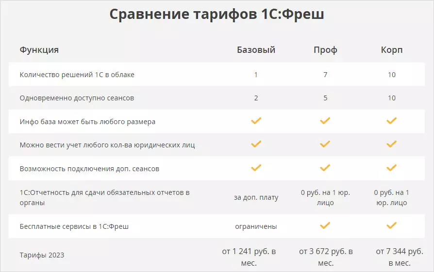 Количество одновременных сеансов – это один из критериев, по которому определяется тариф подключения к сервису 1С:Фреш. Есть три основных тарифа: Базовый, Проф и Корп. Ниже представлены цены на Фреш.
