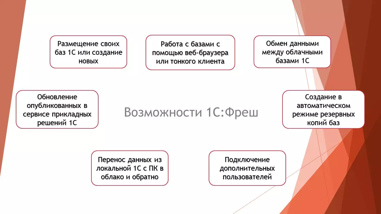 Облачный Фреш – это возможность использовать весь функционал программы 1С без ее установки, подключившись к облаку за 5 минут, и пользоваться всеми его преимуществами