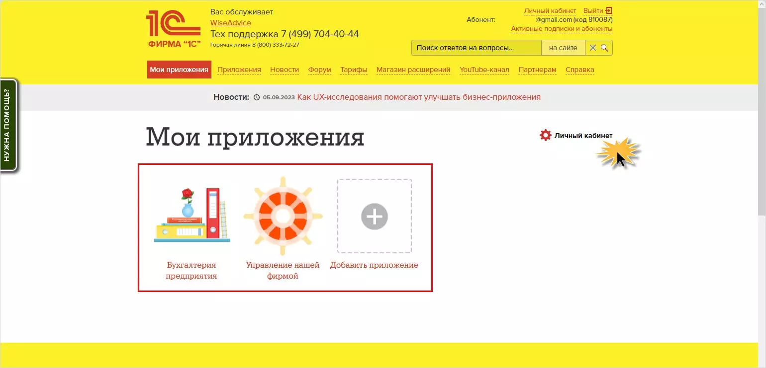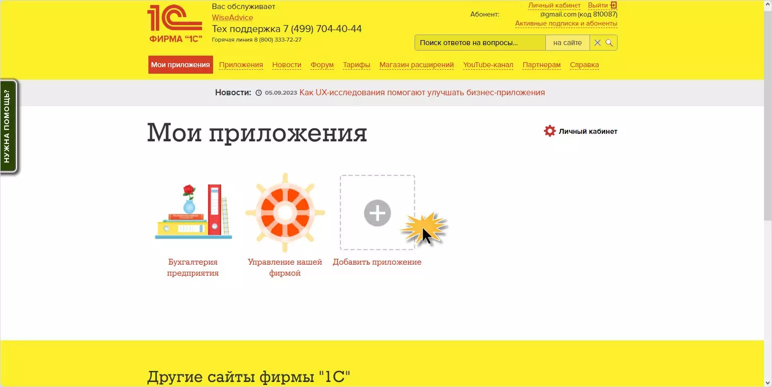 Шаг 1. Получив после регистрации на электронную почту логин и пароль для входа в личный кабинет 1С:Фреш, в разделе «Мои приложения» нажмите квадратик-плюсик «Добавить приложение».