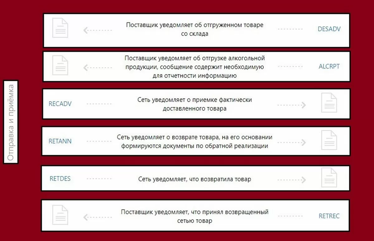 - RECADV – уведомление о фактической приемке товара (может содержать указание на причину отказа).