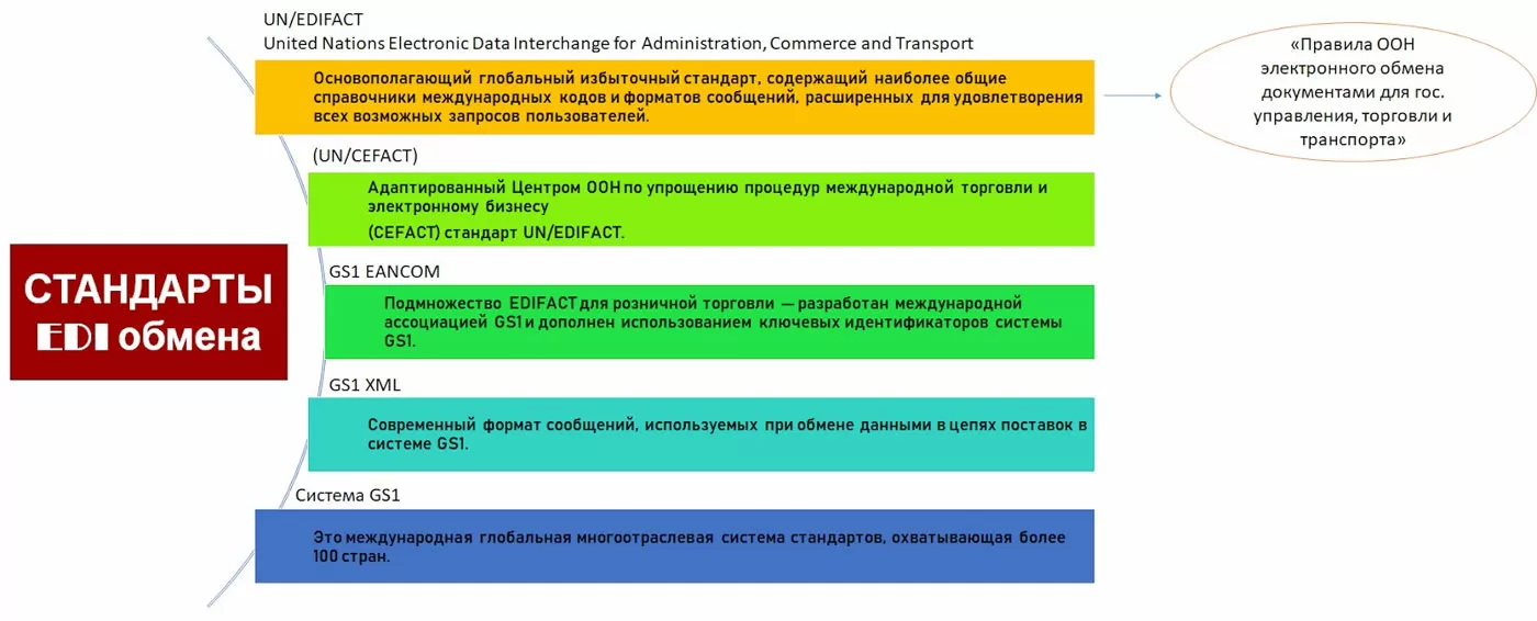 Именно поэтому главным составляющим понятия «EDI» является серия стандартов по передаче структурированных данных в электронном виде между компаниями, базирующаяся на международных регламентах и форматах.