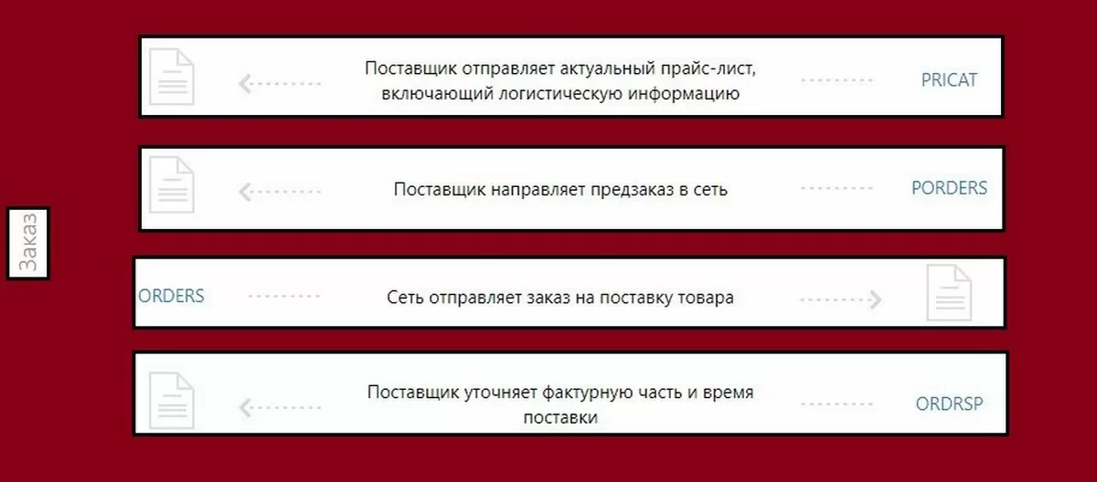 - ORDRSP – подтверждение заказа поставщиком (может содержать уточнение фактурной части и времени поставки);