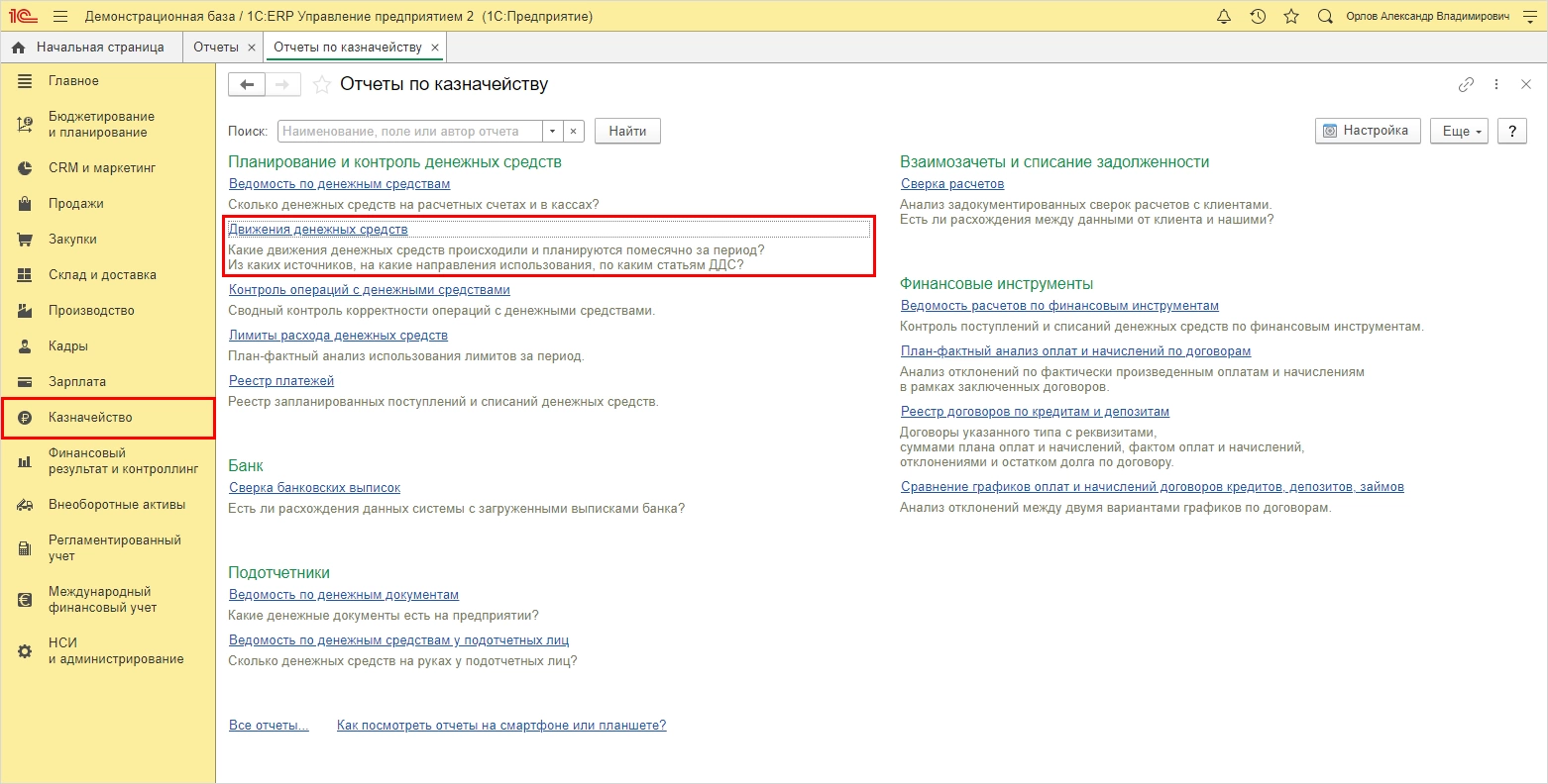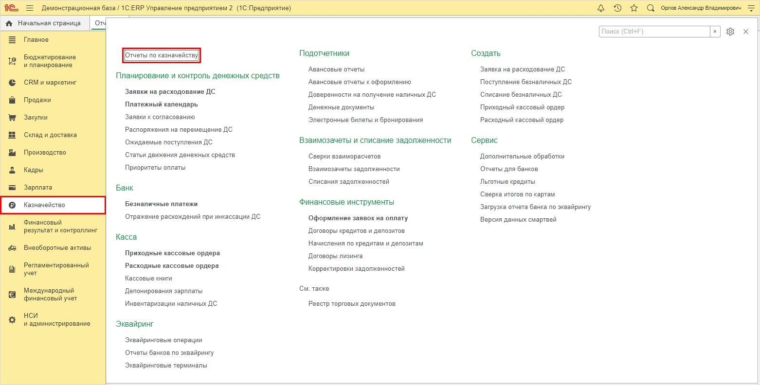 Перейдем в 1С:ERP Управление предприятием в раздел Казначейство – Отчеты по казначейству.