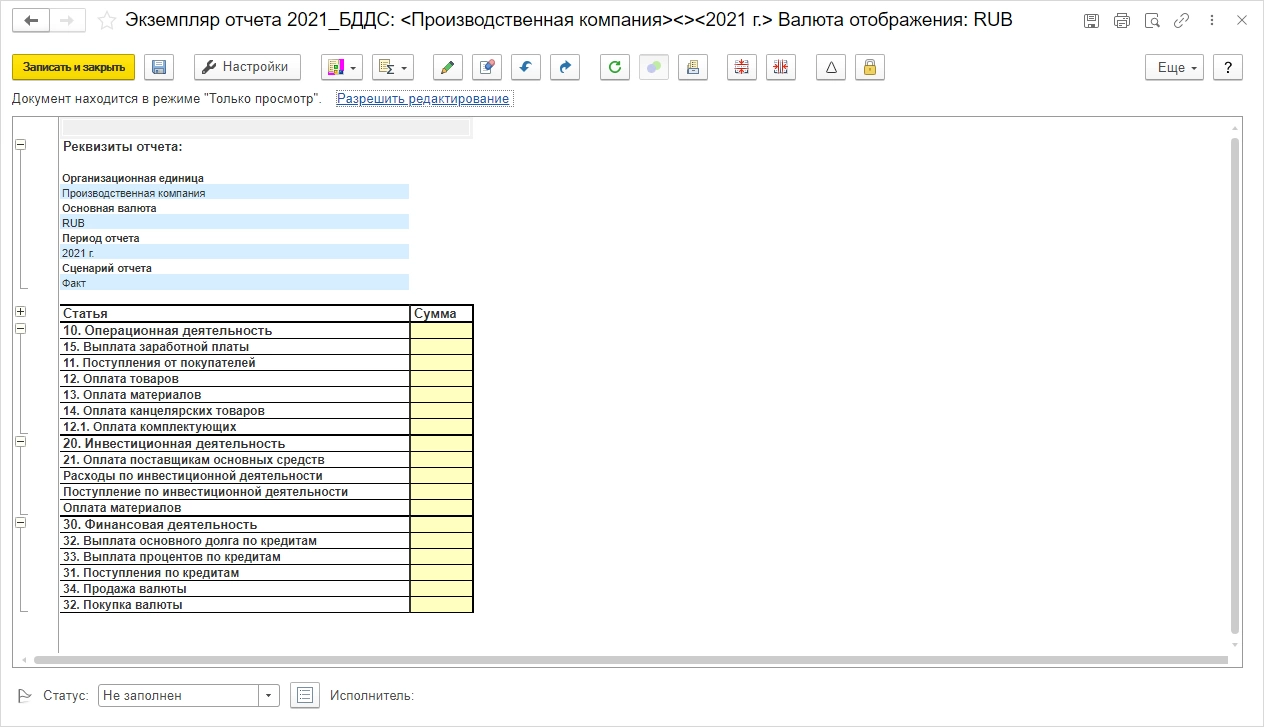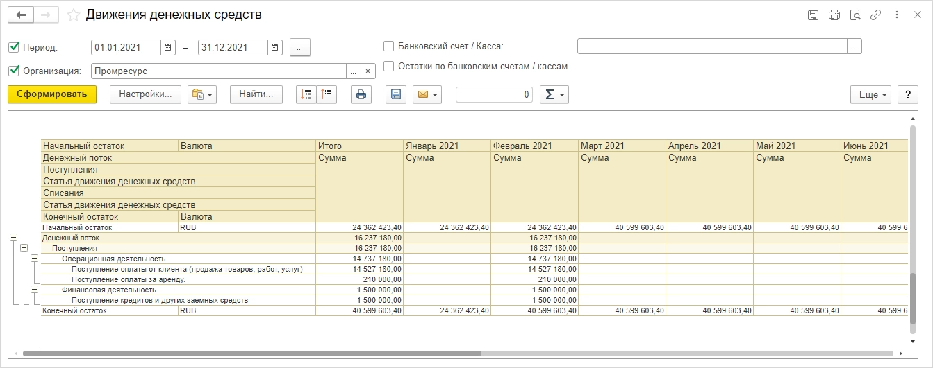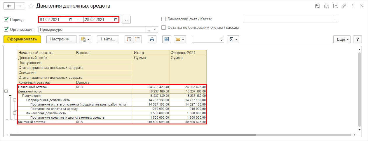 - Пример формирования отчета движения денежных средств в 1С:ERP