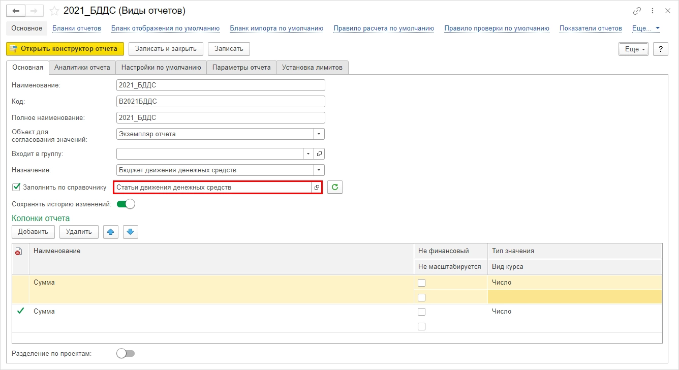 В настройке «Вид отчета» задается порядок заполнения – Статьи движения денежных средств.