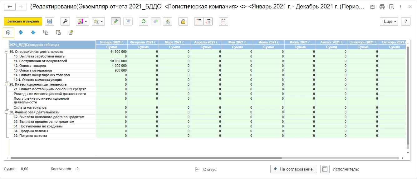 Установив период ОДДС, в таблице увидим информацию о движении денежных средств в разрезе по месяцам в рамках заданного временного срока.