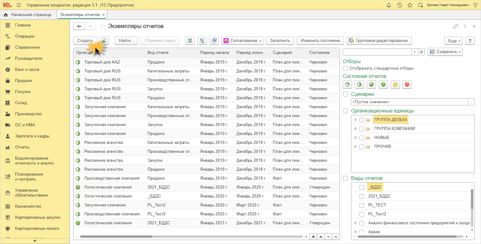 Форма отчета дает пользователю возможность вводить и согласовывать данные, получать динамические итоги, упрощая моделирование форм, сравнивать показатели, рассчитывая отклонение и т.п. Это удобный инструмент для проведения анализа данных. Также пользователь может создавать свои варианты отчетов по кнопке «Создать».