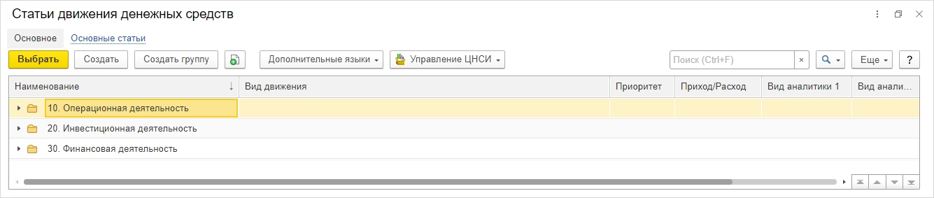В конфигурации 1С:Управление холдингом справочник статьи движения денежных средств представлен также в разрезе видов деятельности.