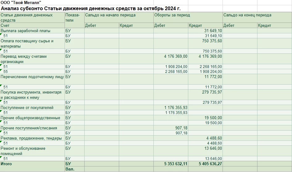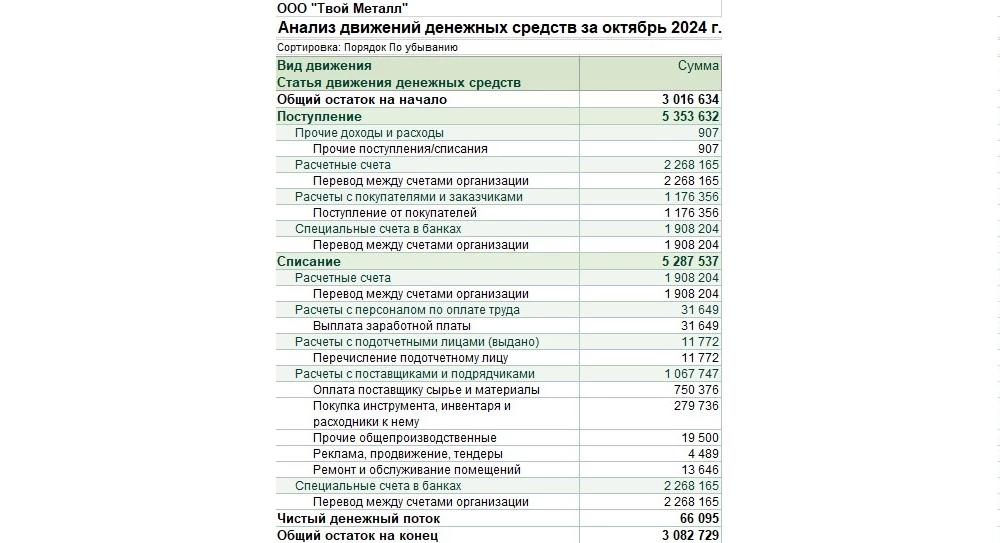 ООО «Твой металл» по результатам 9 месяцев составило промежуточный ответ о движении денежных средств, где говорится, что в отчетном периоде на расчетный счет организации и в кассу поступила выручка от продажи металла и комплектующих к нему на сумму 18 100 000 рублей. Также от сдачи собственных помещений сторонним контрагентам по договорам аренды за 9 месяцев зачислено 4 245 000 рублей. Прочих поступлений зачислено 3 283 000 рублей.