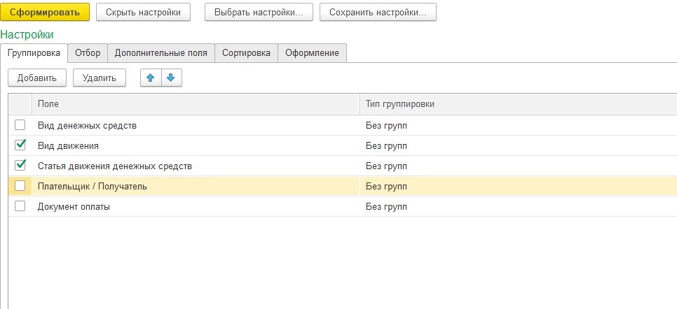 В настройках отчета также можно выбрать группировку по плательщику или получателю денежных средств, дополнительную расшифровку по документам оплаты.