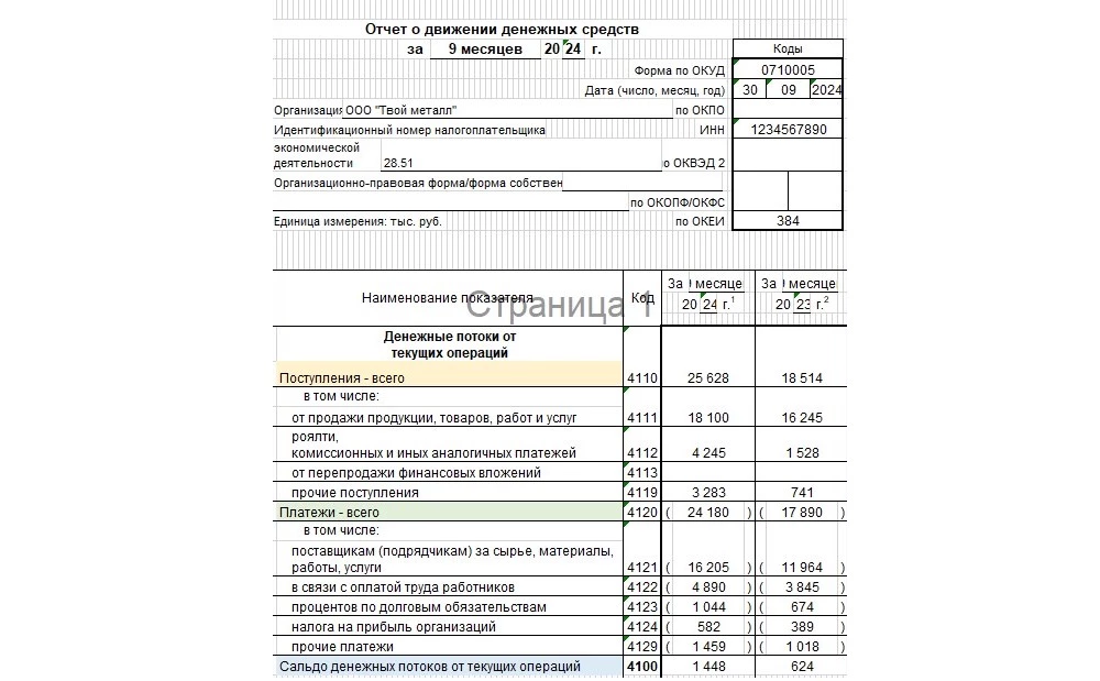 ООО «Твой металл» за этот период перечисляла своим поставщикам за товар и сопутствующие товары, а также за другие операционные товары и услуги сумму 16 205 000 рублей. Оплачивала заработную плату работникам на сумму 4 890 000 рублей, проценты за пользованием кредитом на текущие нужды – в размере 1 044 000 рублей. Прочие платежи составили 1 459 000 рублей, а налоги на прибыль организации за 9 месяцев оплачены в размере 582 000 рублей.