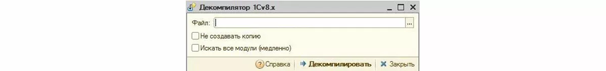- Поле для выбора файла. Декомпилятор принимает файлы с расширением epf, erf и cf;