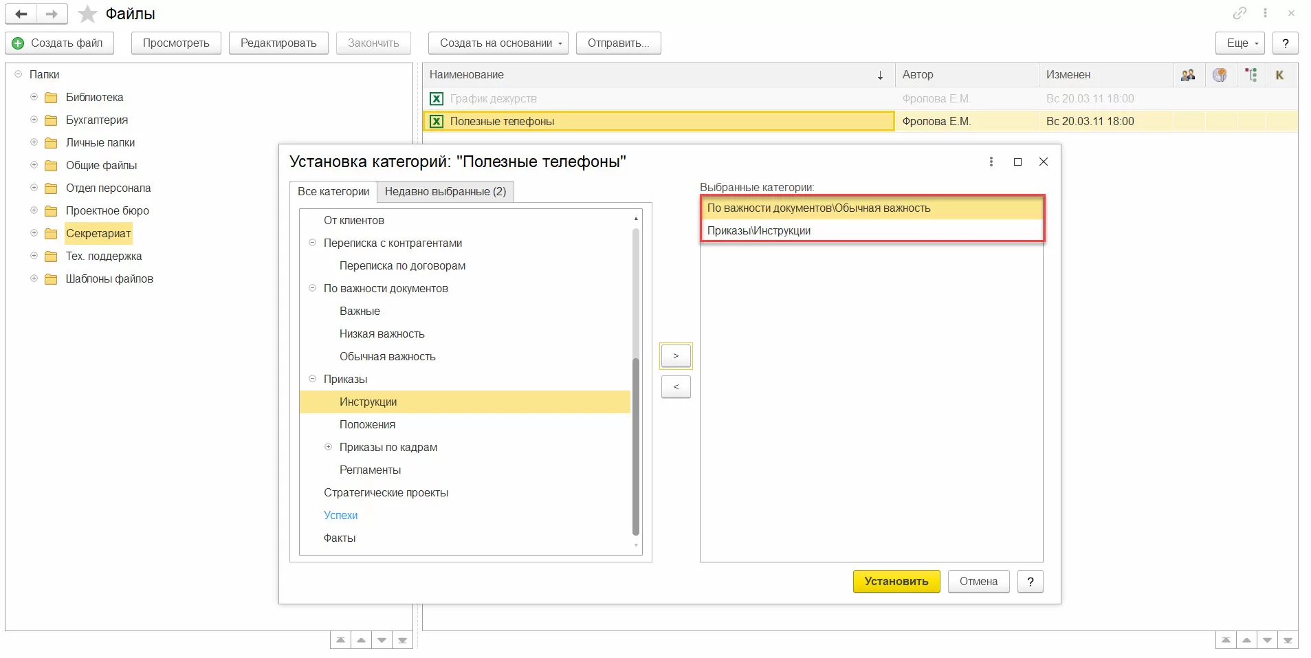 Личные категории отображаются в списке синим цветом. Категории могут быть установлены файлу или документу вручную по команде Установить категории. Далее нужно будет отметить выбранные категории в отдельном окошке, либо просто перетащить мышкой документ в нужную категорию.