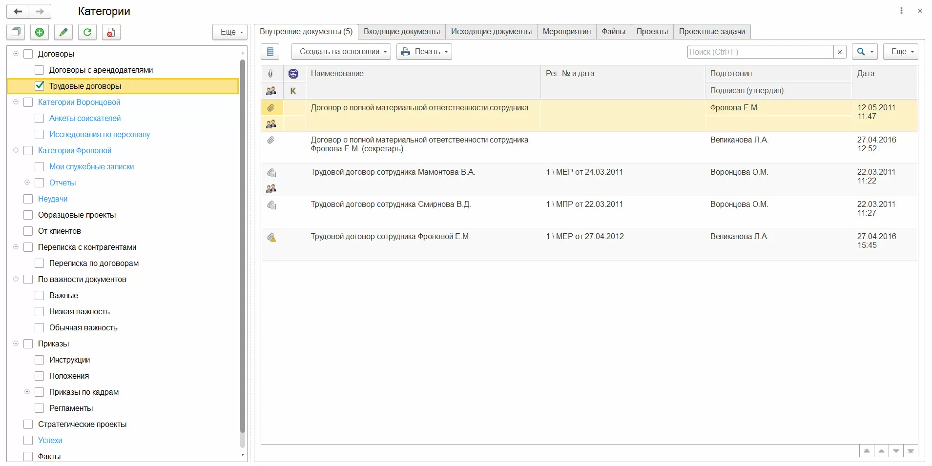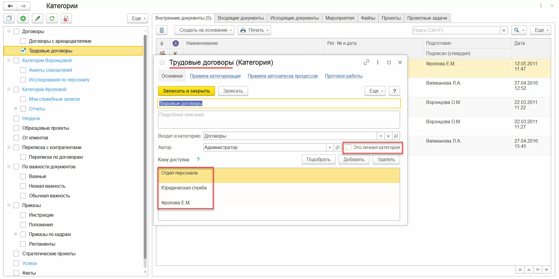 Если выставить галку «Это личная категория», то список пользователей виден не будет - категория будет доступна лишь автору. В рабочем месте категорий можно задавать сложные отборы и тем самым выбирать документы "на пересечении" нескольких различных категорий. Также при включенном категорийном учете сами списки документов и файлов можно показывать в представлении категорий.