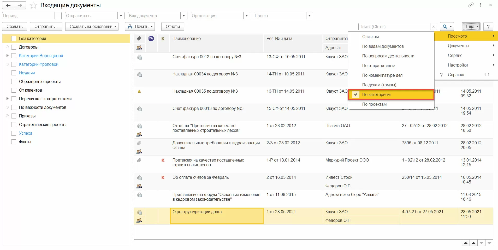 На случай, когда отдельные файлы или документы не могут быть корректно обработаны по правилам (или, напротив, это исключение из правила), существует механизм проверки категорий. В нем категории можно установить вручную, а также указать необходимость использования для данного документа/файла автоприсвоение категорий. Заметим, что категоризироваться могут не только все виды документов и файлы, но и Контрагенты, Мероприятия, Проекты и Проектные задачи.