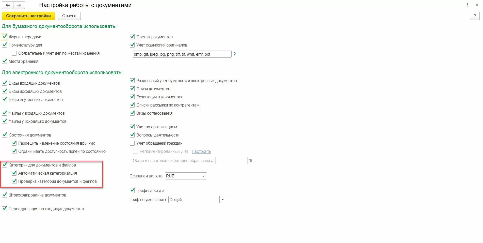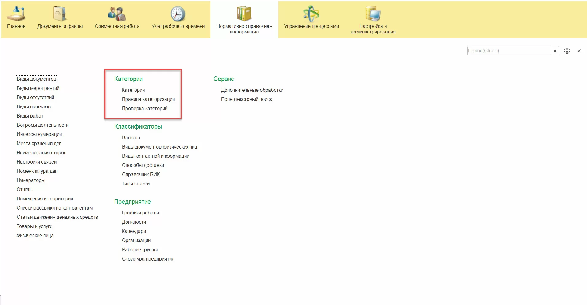 Категории включаются соответствующей функциональной опцией в разделе Делопроизводство. Тут же включается автокатегоризация и опция проверки категорий.