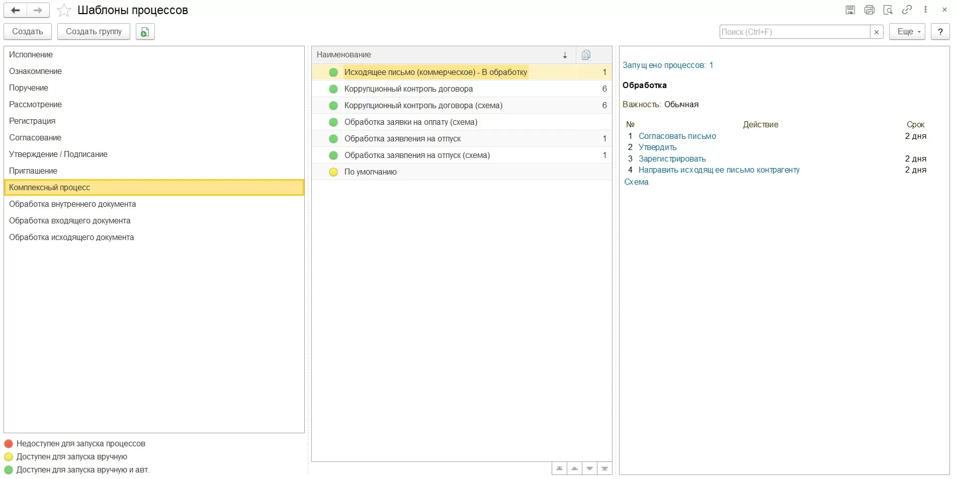 Или, например, виды документов Договор аренды, Договор подряда и Договор строительства можно объединить в группу Договорная документация и назначить им шаблон процесса.