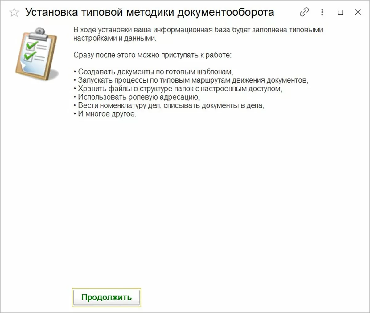 Главное: устанавливаем типовую методику документооборота. Обращаем внимание на то, что методика предназначена для установки в пустую базу. При установке в заполненную базу уже имеющиеся данные будут дополнены новыми.