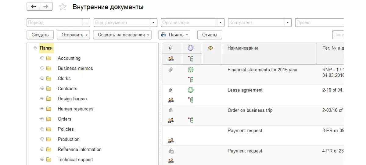 Группировка внутренних документов по папкам облегчает процессы делопроизводства, хранения и поиска.