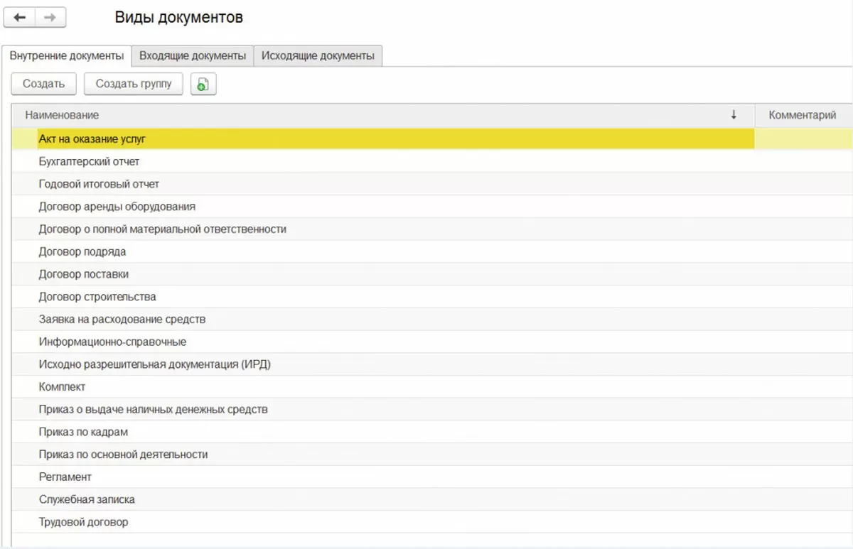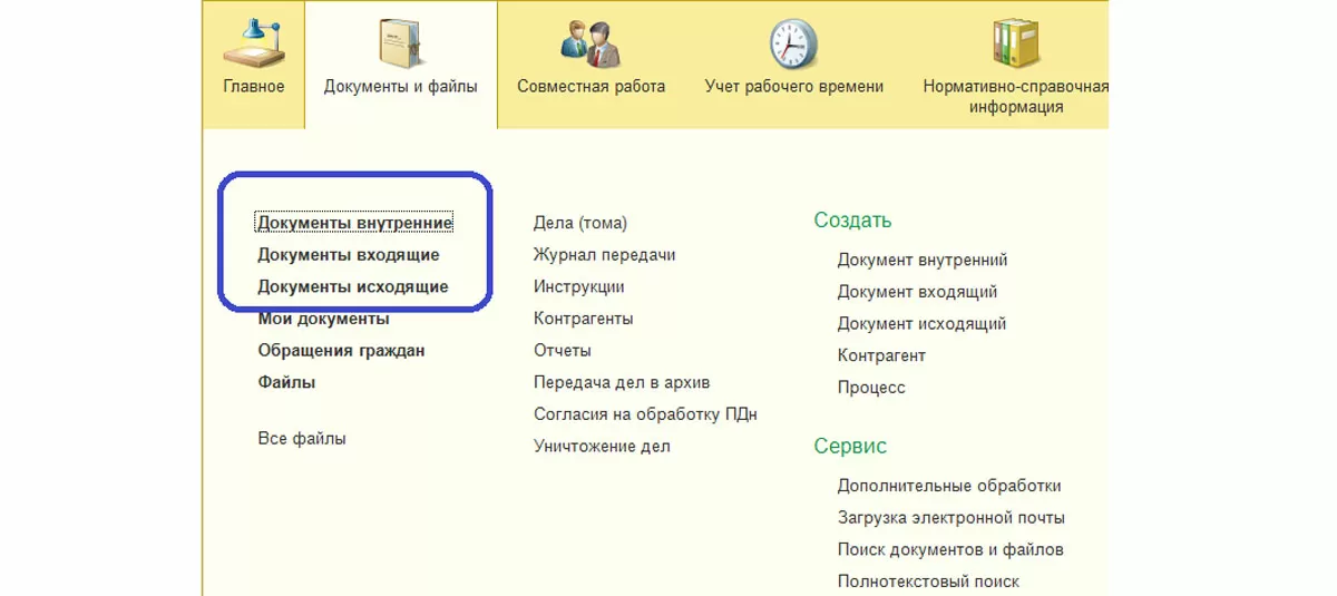 В соответствии с потребностями коммерческой организации документы в программном решении 1С разделены на внутренние, входящие и исходящие. Начальный доступ к ним можно осуществить посредством меню «Документы и файлы», выбрав нужный пункт.