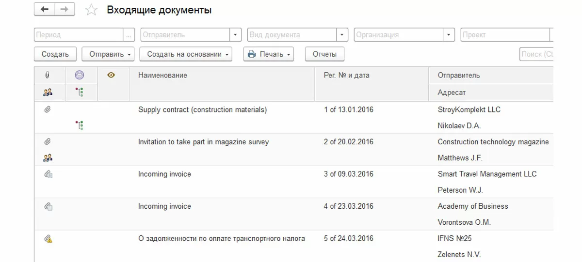В «1С:Документообороте» заложен механизм автоматического ведения списков всех входящих, исходящих и внутренних документов в фирме.