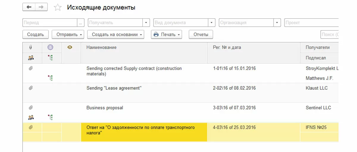 Исходящие документы создаются двумя способами: инициативно, ответом на входящий документ, или решение 1С самостоятельно проставляет входящему документу статус «Отправлен ответ». То есть в «1С:Документообороте» входящая/исходящая документация составляется в цепочки для удобства дальнейшей работы с ней, но, так же как и внутренние, исходящие документы отдельно отображаются в соответствующем журнале.