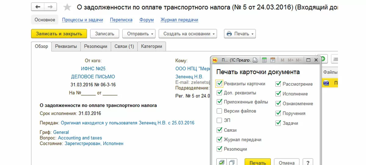 УРК создается программой 1С автоматом после того, как новой документ занесен в базу. У пользователя есть возможность самостоятельно настроить список полей, а также отправить карточку на печать.