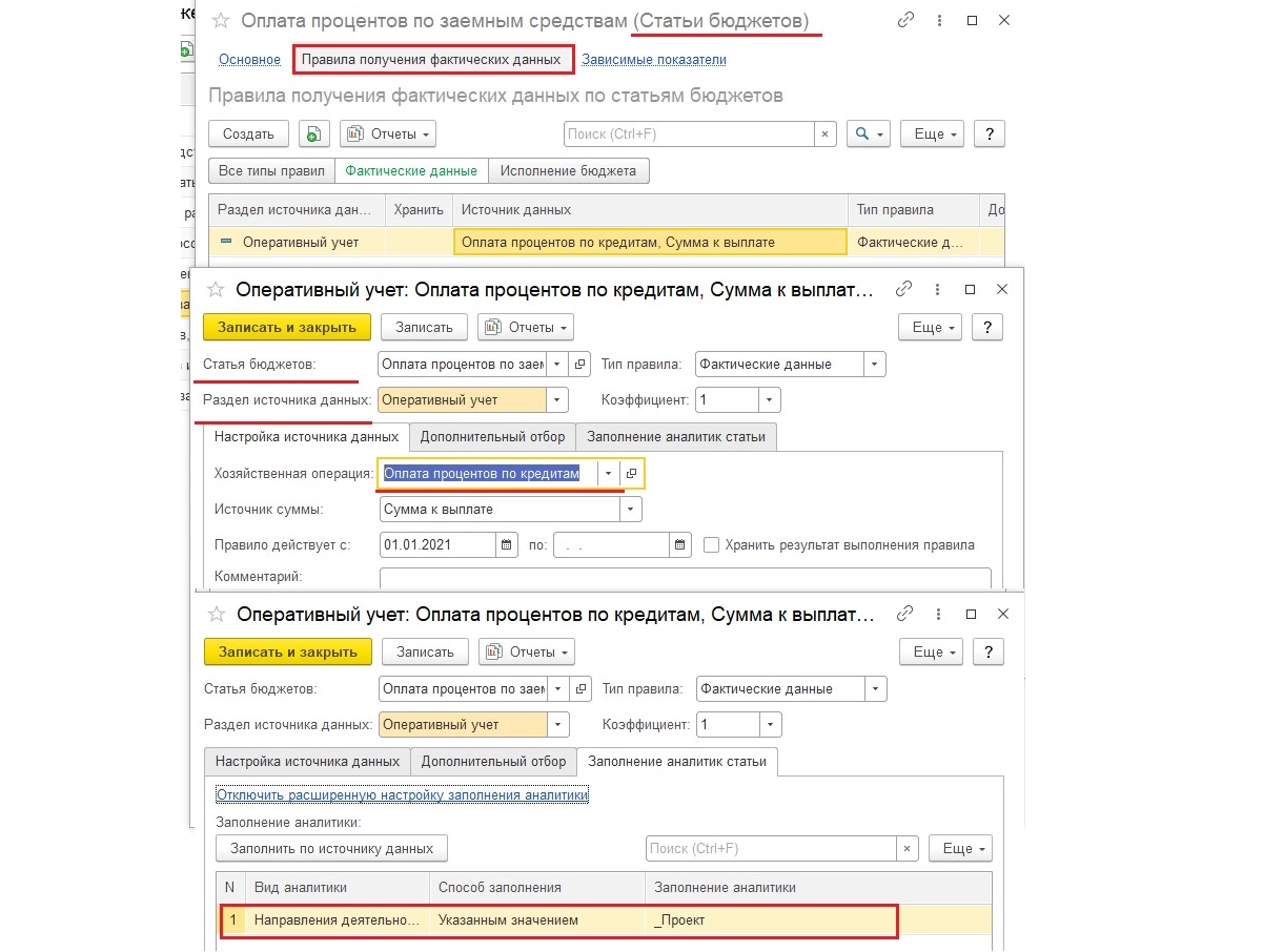 Источники получения фактических данных задаются непосредственно в показателях и статьях бюджет. В данном случае это элементы справочника «Статьи ДДС» с отбором по «Направлению деятельности» (проект).