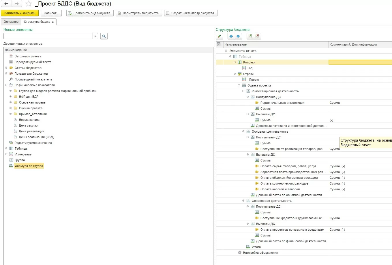 Механизм «Структура бюджета» достаточно гибкий, что позволяет настроить вывод практически любых показателей для планирования и анализа. Например, вот так может выглядеть настройка расчета планируемых денежных потоков проекта: