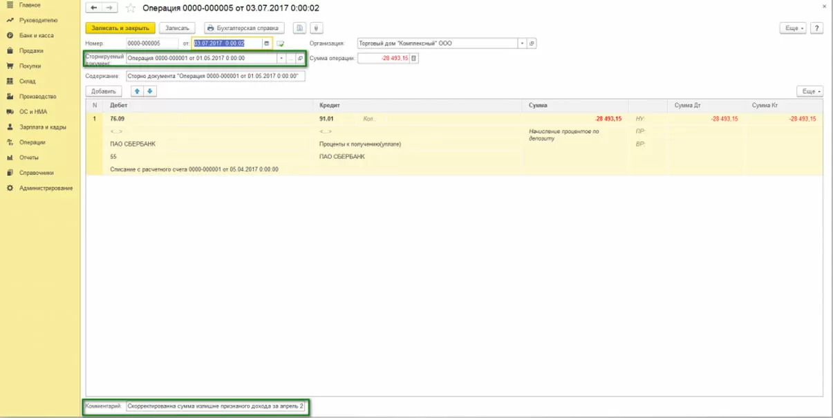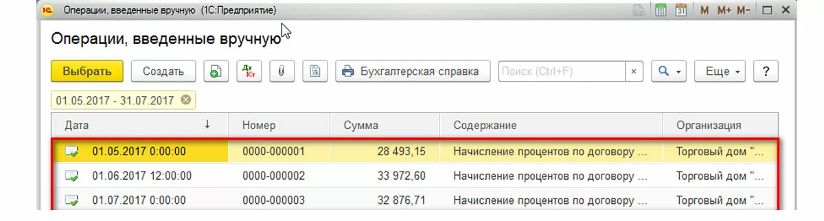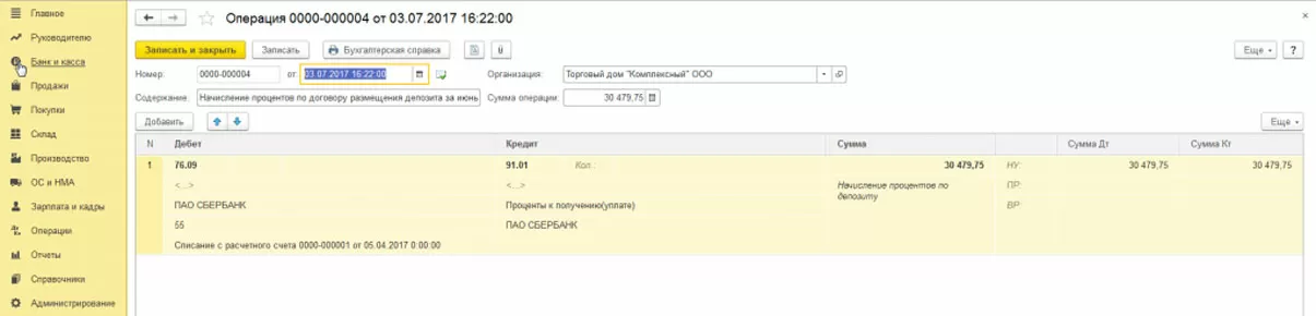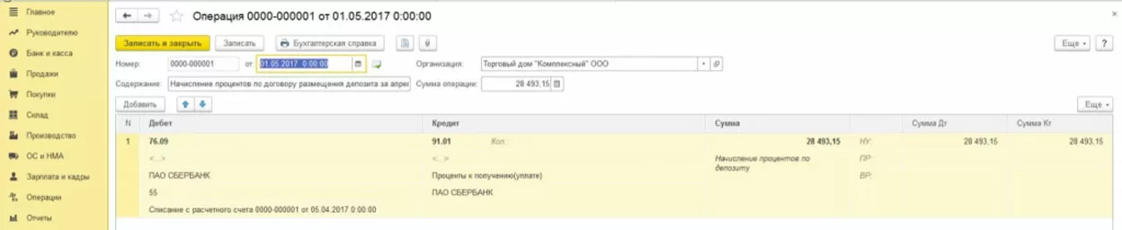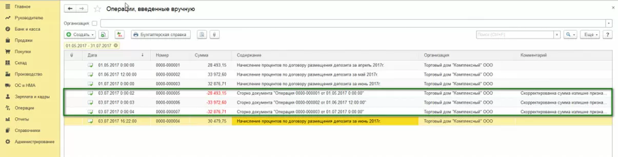 Теперь нам необходимо в программе 1С:Бухгалтерия 8.3 провести корректировки по начисленным процентам за апрель, май, июнь 2017 г. в связи с излишним начислением процентов по размещению депозита.