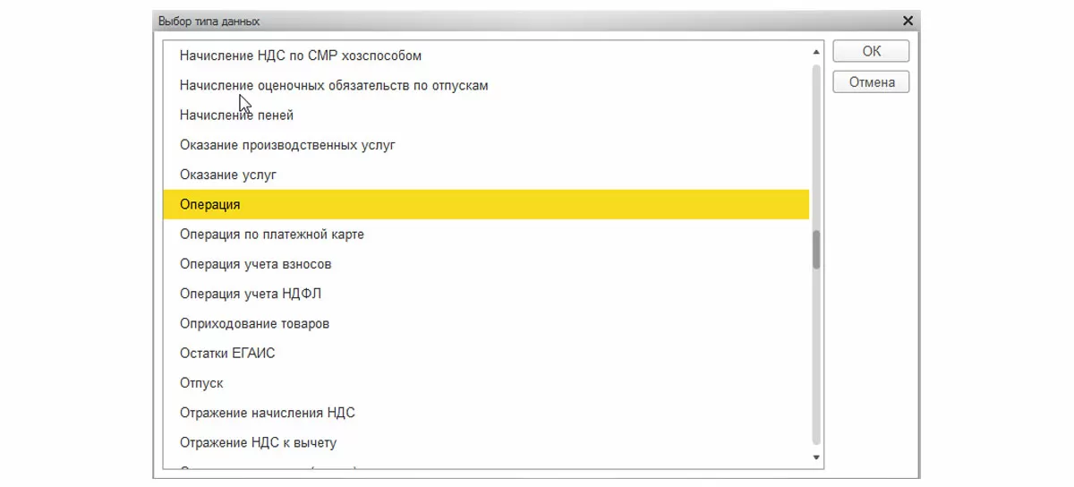 Нам необходимо отразить в программе операцию по начислению процентов за апрель месяц. Заходим Операции/Операции, введенные вручную/Создать/Вид документа выбираем – «Операция»