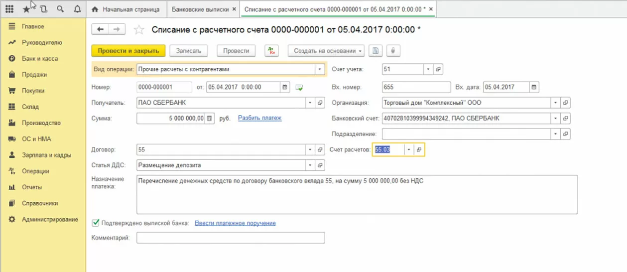 Отражаем перечисление денежных средств на депозит в программе «1С:Бухгалтерия 8.3».