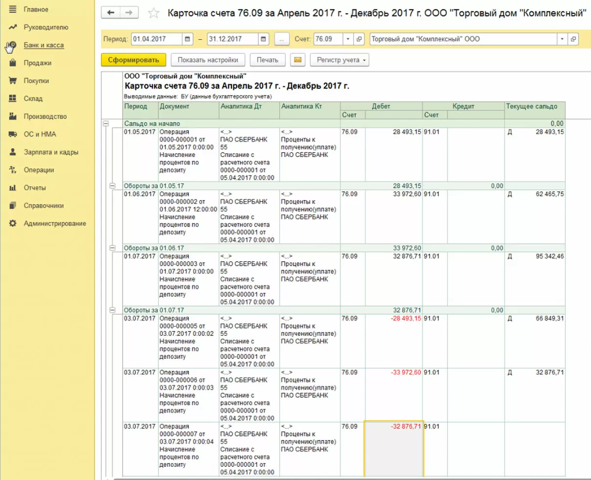 Для проверки суммы начисленных процентов в программе «1С:Бухгалтерия 8.3» нужно сформировать отчет «Карточка счета», указав в отборе счет 76.09.