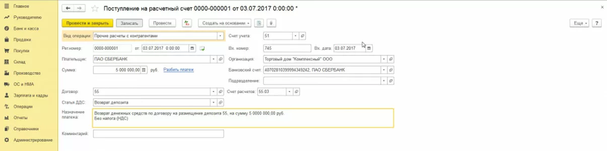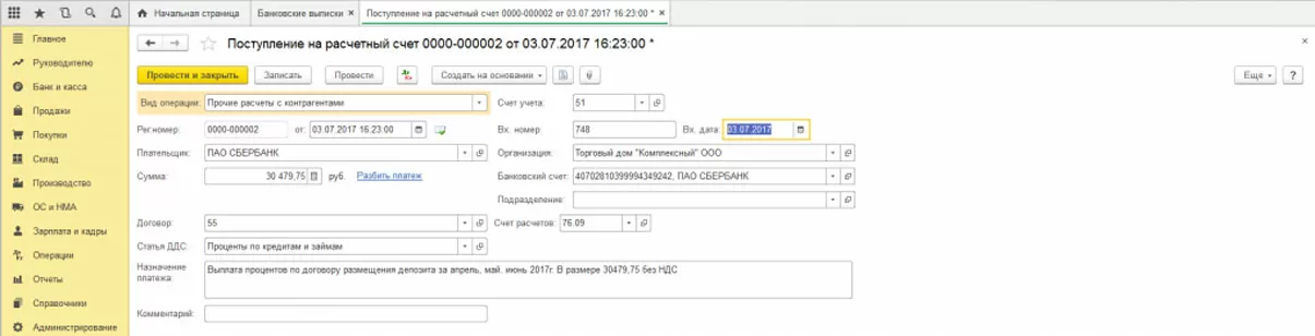 03.07.2017 организация ООО «Торговый дом «Комплексный» досрочно расторгает договор на размещение депозита с кредитной организацией. Для отражения этой операции в программе 1С:Бухгалтерия 8.3 создаем документ «Поступление на расчетный счет» в ручном режиме, заходим Банк и касса/Банковские выписки/Поступление.