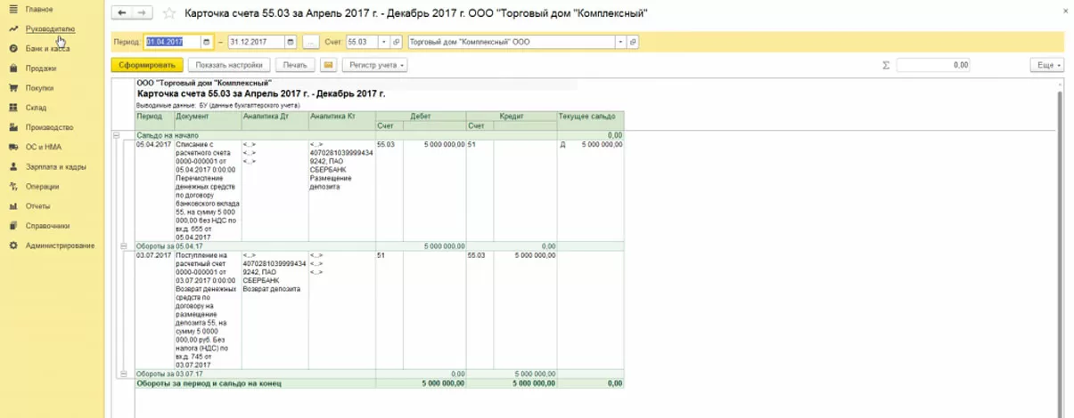 Просмотреть остаток по сумме депозита в программе «1С:Бухгалтерия 8.3» можно, сформировав отчет «Карточка счета» и указав в отборе счет 55.03.