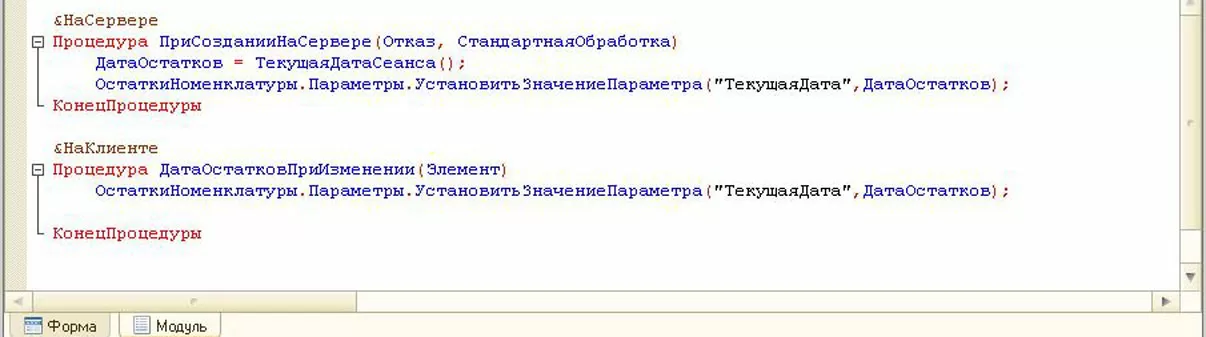 Добавляем реквизит «ДатаОстатков» типа «Дата» и переносим его в элементы формы. В событиях поля создаем событие «ПриИзменении» и прописываем код по установке параметра «ТекущаяДата», использующегося в динамическом запросе. Чтобы при открытии формы пользователь сразу понимал, на какую дату он видит остатки, внесем небольшие изменения в процедуру «ПриСозданииНаСервере».