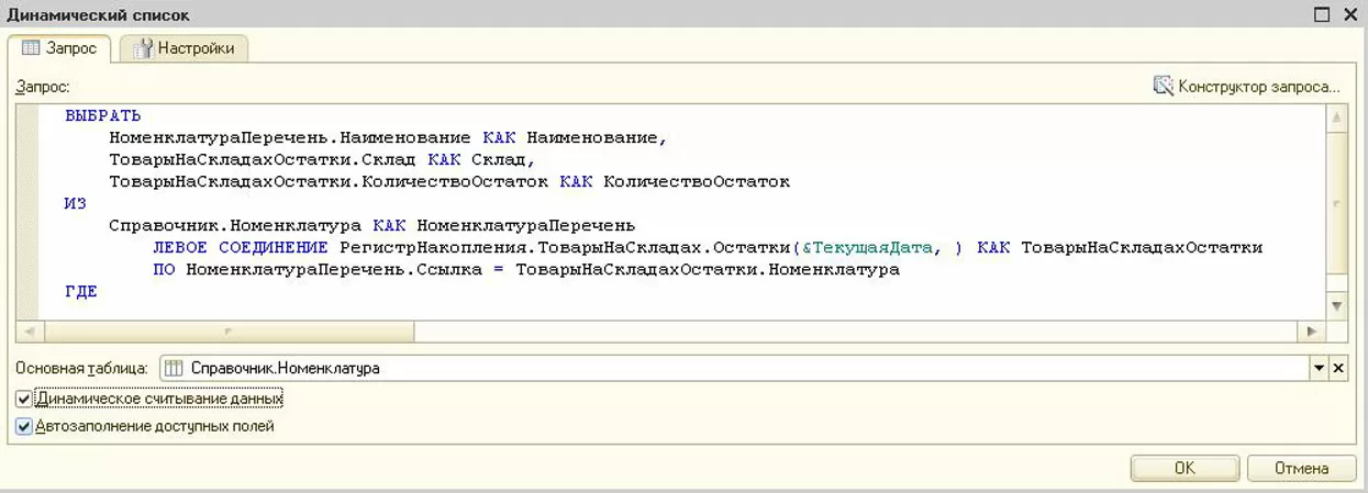 В качестве примера рассмотрим задачу по отражению на управляемой форме остатков номенклатуры. В реальной практике подобные заказы встречаются достаточно часто в различных конфигурациях, и динамический список идеально подходит в качестве инструмента. Для этой задачи нам придется использовать произвольный запрос, параметры динамического списка и его настройки.