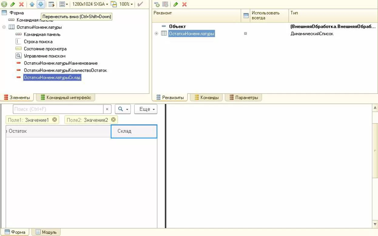 Так как в нашем запросе использовался параметр «ТекущаяДата», то нам необходимо задать его значение перед тем, как пользоваться обработкой. Для этого в модуле формы в процедуре «ПриСозданииНаСервере» стандартной командой присвоим ему функцию «ТекущаяДатаСеанса». Также нам необходимо вывести динамический список на управляющую форму и изменить порядок полей для наглядности. Перетаскиваем реквизит «ОстаткиНоменклатуры» в элементы формы (левая верхняя часть) и синими стрелками изменяем порядок полей в таблице на форме.