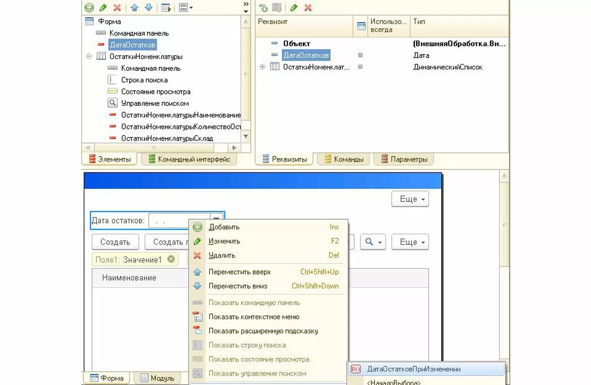 Уже на этом этапе мы можем в 1С открыть нашу внешнюю обработку и увидеть, что динамический список работает. Мы можем смотреть остатки, создавать номенклатуру и группы, осуществлять поиск. Часто заказчики просят добавить возможность выбирать дату, на которую они будут видеть остатки. В случае формы с динамическим списком это обеспечивается за счет дополнительного поля и установки параметров с его помощью.