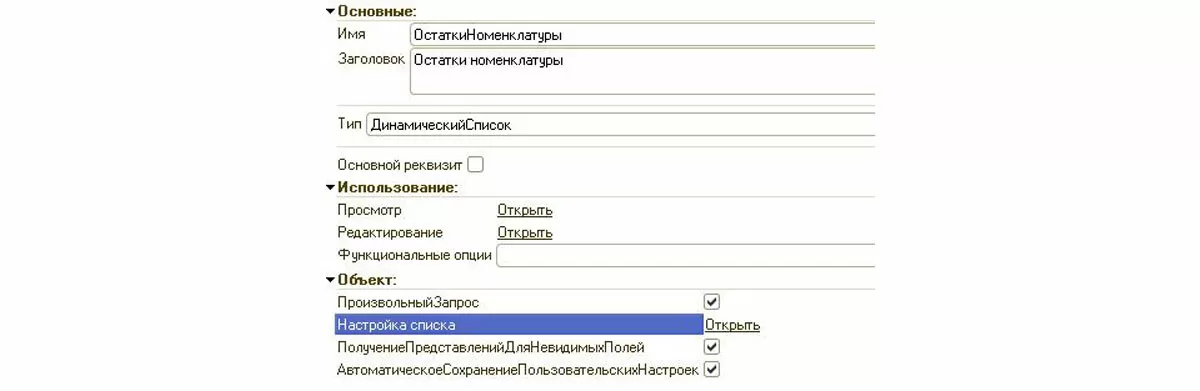 Еще одно полезное свойство динамического списка открывается при щелчке на надпись «Настройка списка». Это меню позволяет даже при использовании стандартного набора полей сделать информацию более доступной и понятной конечным пользователям. Вне зависимости от того, произвольный запрос или нет, вы увидите вкладку «Настройки», где сможете указать: